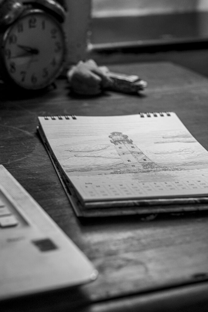 I found this line drawing made by my son on my daughter’s writing desk this morning. Back in Jan, As a birthday gift for his sister, my son gave her a desk calendar wherein he sketches a theme on each month. In his own way, he’s on an art piece a month, like my photo-a-day project.